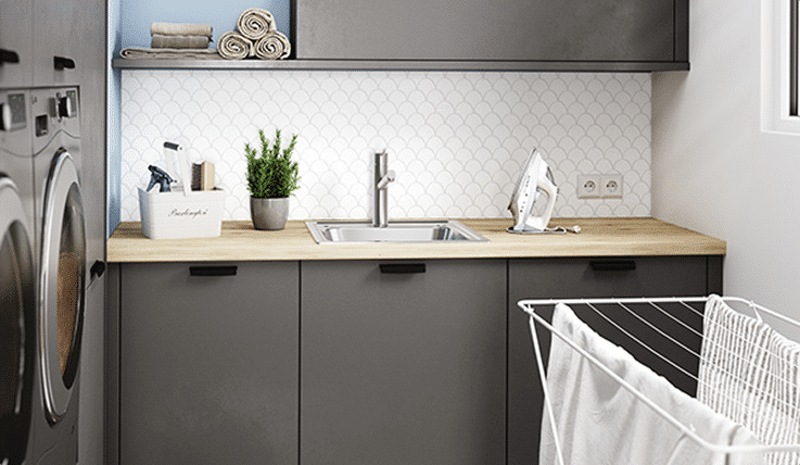Pensez à installer un point d’eau dans votre buanderie. Multi-usage et toujours utile, avoir un évier et un robinet à portée de main est toujours un plus et vous évite des trajets inutiles. Par exemple, cela vous permet de rincer un vêtement avant de le mettre à la lessive, de laver à la main le linge délicat ou encore d’essorer une chaussette oubliée dans la machine à laver. Autant de choses vous permettant d’optimiser votre temps.