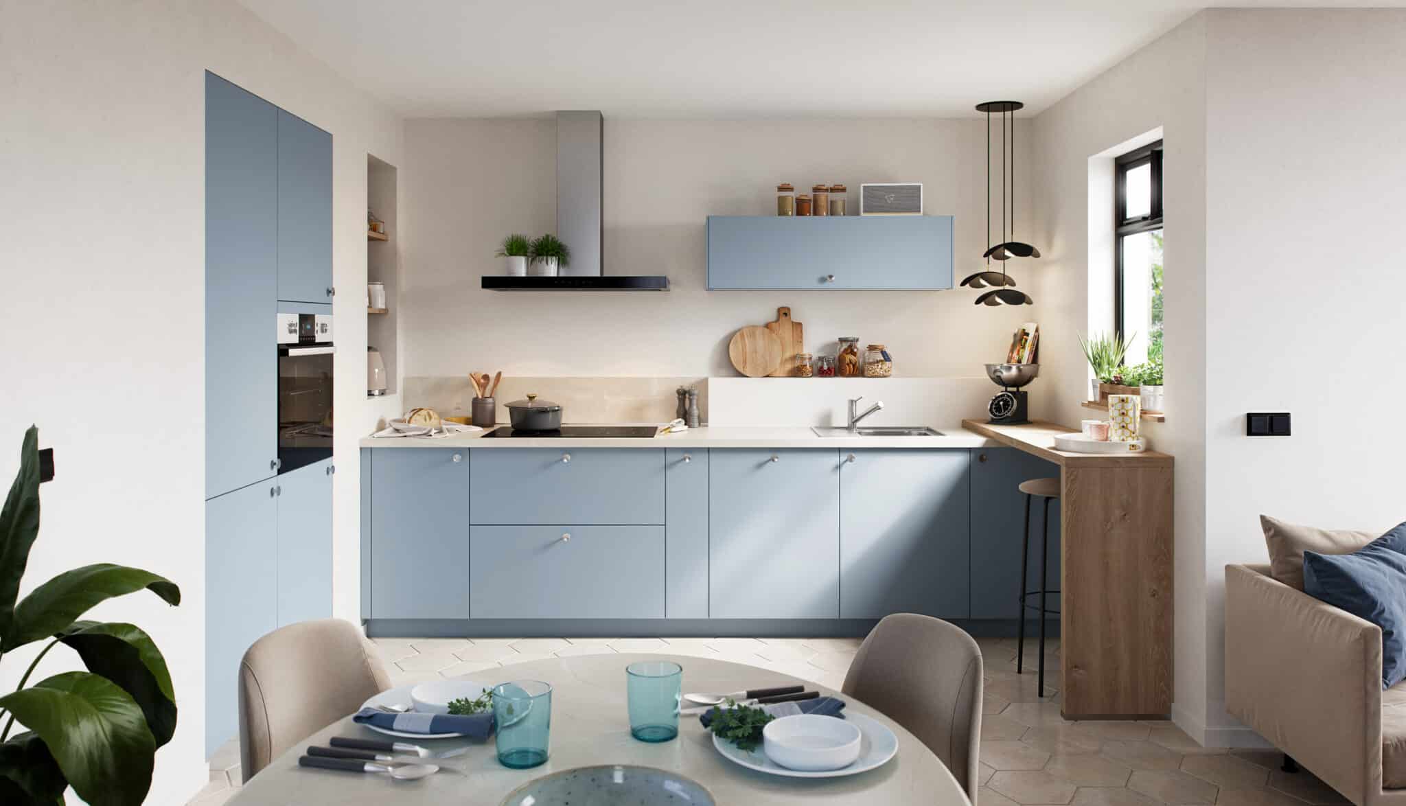 La cuisine de Charly allie audace et fonctionnalité avec ses façades d’un bleu moderne et son agencement aux colonnes intégrées. Entre les niches ouvertes design et le superbe comptoir en bois devant la fenêtre, l’espace devient un lieu de vie baigné de lumière, parfait pour cuisiner ou partager un repas. Chez èggo, chaque détail a été pensé pour créer un ensemble harmonieux, prouvant qu’on peut s’offrir un design de caractère sans aucun compromis sur le budget.