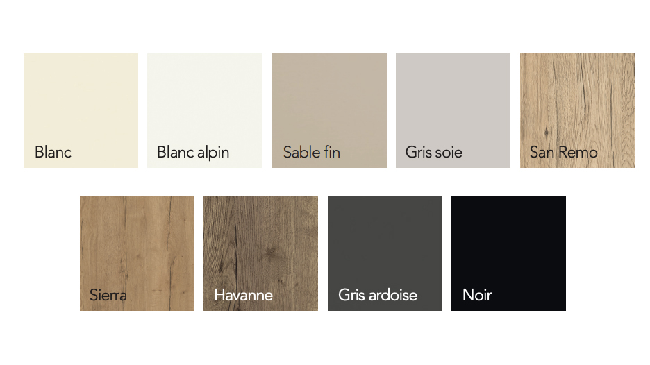Le corps de meuble constitue la base de votre cuisine équipée SMART. Robuste et fiable, il garantit la stabilité et la longévité de l’ensemble. Vous avez le choix parmi 9 corps de meubles aux couleurs et finitions actuelles, pensées pour s’harmoniser parfaitement avec les façades sélectionnées.
