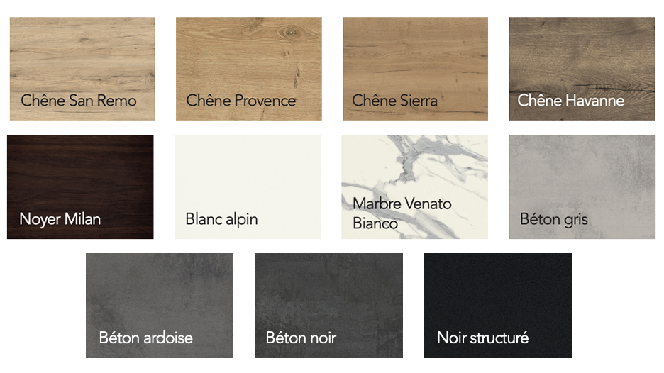 Le plan de travail doit être à la fois résistant, facile d’entretien et en parfaite cohérence avec le design global de votre cuisine. La collection SMART propose 11 finitions et matériaux soigneusement choisis : différentes teintes d’effet bois (bois de chêne et bois de noyer), des tons blancs ou noirs et des effets béton ou marbre.