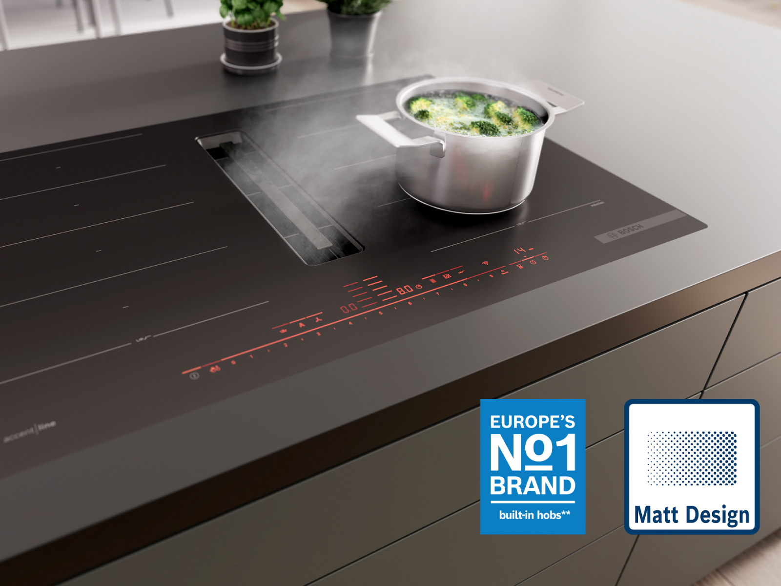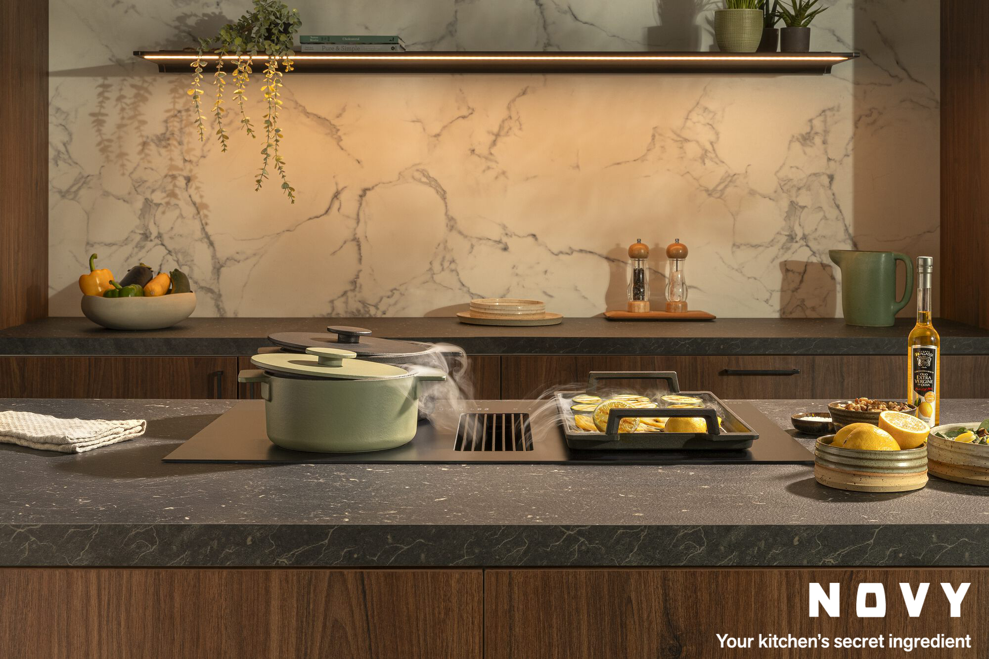 La Novy Easy Matte Line est une plaque de cuisson à induction avec hotte intégrée silencieuse et une finitions en verre noir mat, réduisant les traces de doigts pour une cuisine élégante et facile à entretenir.