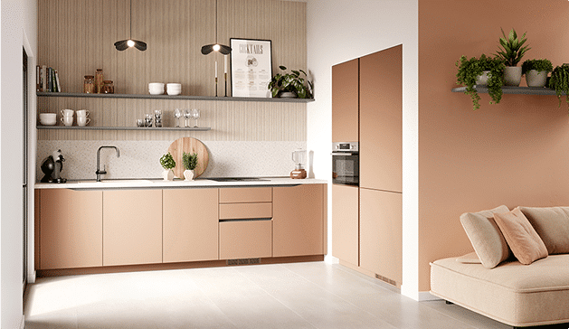 En wat dacht je van het gloednieuwe roze oker? Met zijn subtiele mengeling van warme en poedervormige tonen laat het elke ruimte er zachter uitzien en creëert het een natuurlijke elegantie. Deze kleur oker is ideaal voor wie een moderne en tegelijk zachte keuken wil en kan perfect gecombineerd worden met materialen als licht hout of marmer.