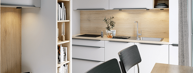 Een studio met een uitgeruste keuken? Tuurlijk! Je kiest het beste voor een model met ingebouwde toestellen. Zulke keukens zijn extreem goed aangepast aan beperkte oppervlaktes en kunnen tegen een muur geplaatst worden.
