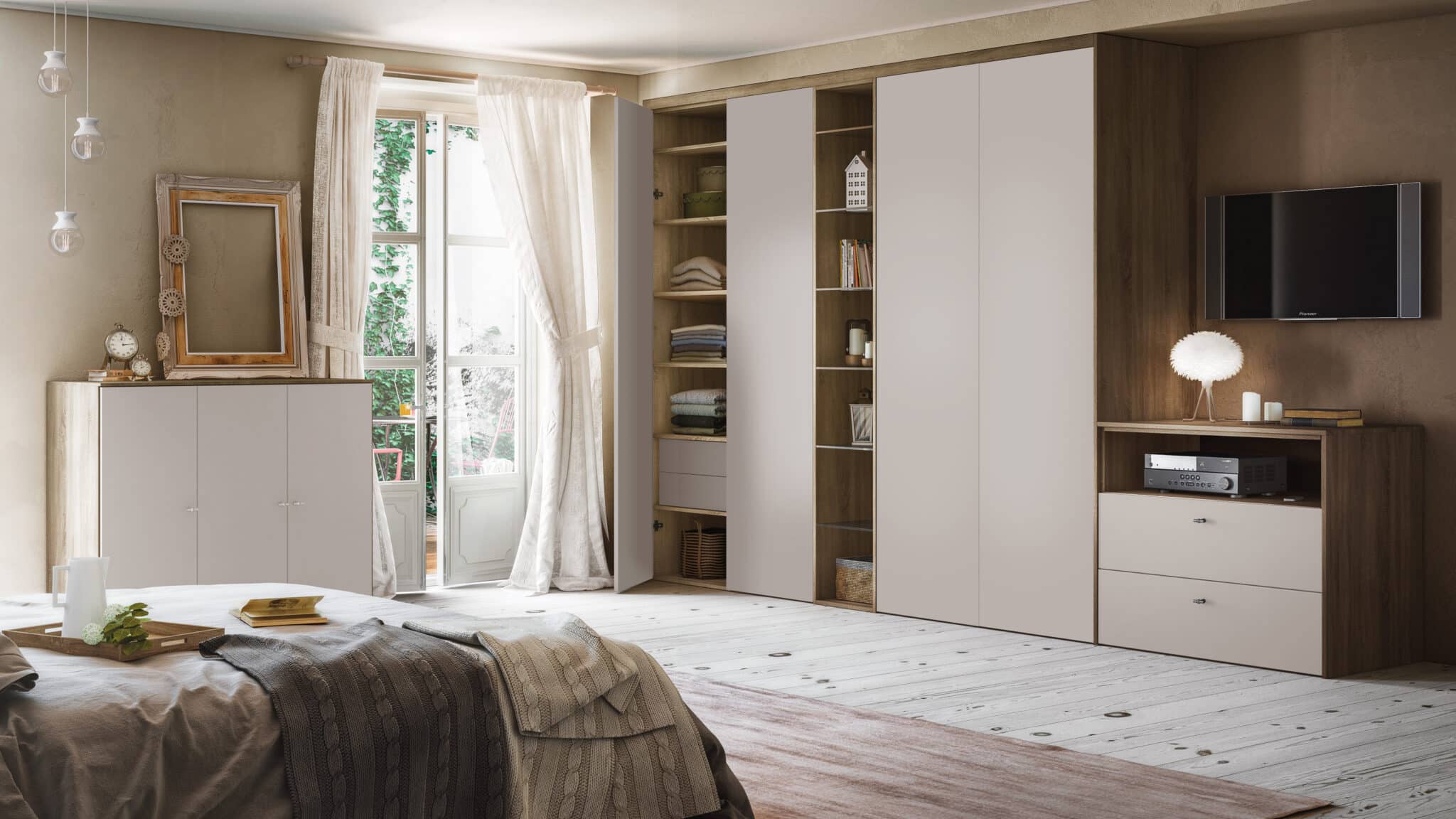 Als je genoeg plaats hebt, zal een kast in U-vorm perfect zijn om alles optimaal weg te bergen. Je behoudt bovendien voldoende ruimte om vrijuit te bewegen door het centrale deel van de kamer. Kies naar eigen goeddunken voor schuifdeuren of draaideuren.